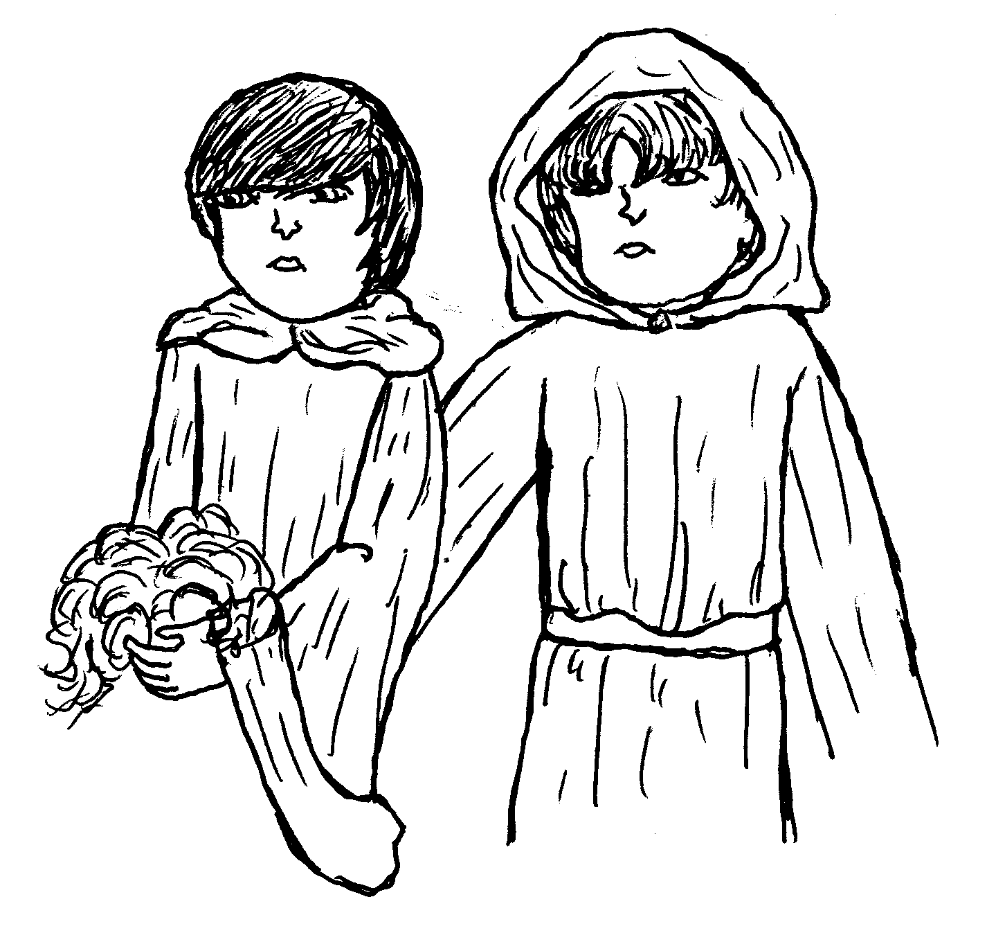 hood and cowl over a baggy brown shirt, that was strapped around the
